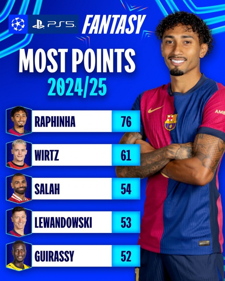 1月24日讯 欧冠小组赛阶段第7轮比赛已经完赛,欧冠官方也统计了本赛季球员表现积分情况,拉菲尼亚领跑。